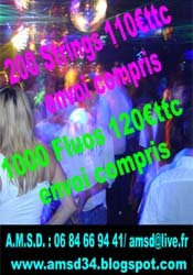 Soirée mousse à partir de 500€ttc, soirée tempête de neige à partir de 350€ttc, soirée CO2 à partir de 500€ttc, dj Jerome.C (vice champion de France dj) 450€ttc, kit 1000 fluos à 120€ttc... Taris hors frais de déplacement au départ et retour de Montpellier.